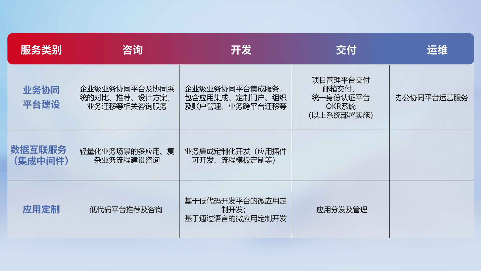 针对钉钉、、、企微、、、、IDaas等平台级产品提供产品的规划、、、、方案、、交付、、、定制化开发等服务,,,,实现如统一协同办公、、、智能客户服务、、、、混合会议管理、、智能数据查询、、等业务场景,,实现数字化转型。。。。